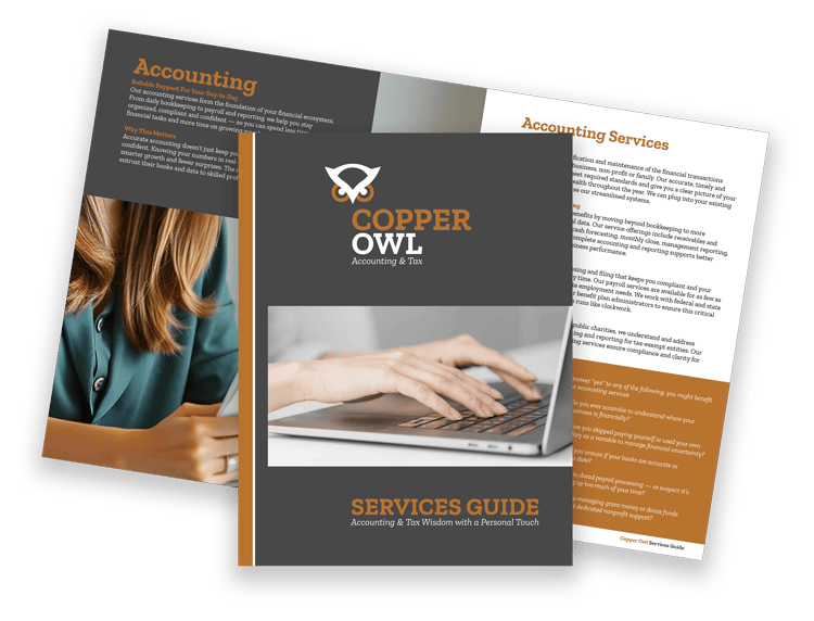 Every business has a unique financial ecosystem — a complex network of bookkeeping, tax, payroll, compliance and strategic planning. Managing these elements effectively is essential, but it doesn’t have to be overwhelming. At Copper Owl, we take a holistic approach to your financial health, ensuring each element works together. Whether it’s navigating tax regulations, optimizing cash flow or streamlining payroll, we craft customized solutions designed to support your success.